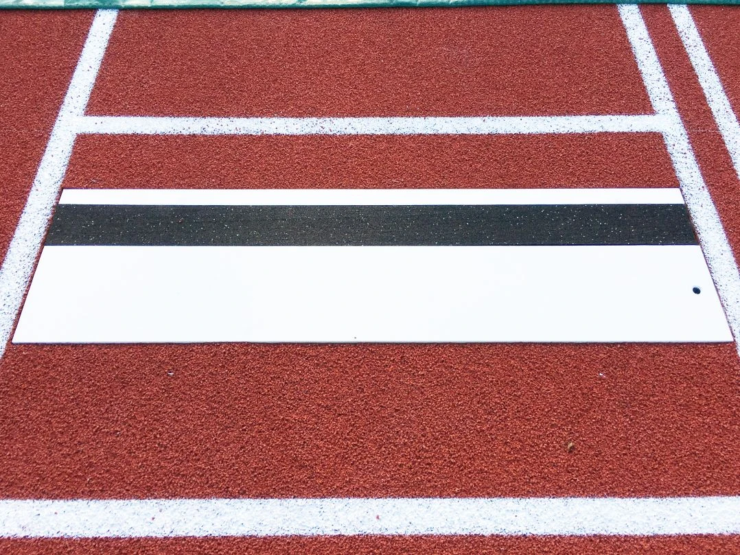 – Eine Seite Kunststoff in Laufbahnfarbe beschichtet (rot) für Dreisprung