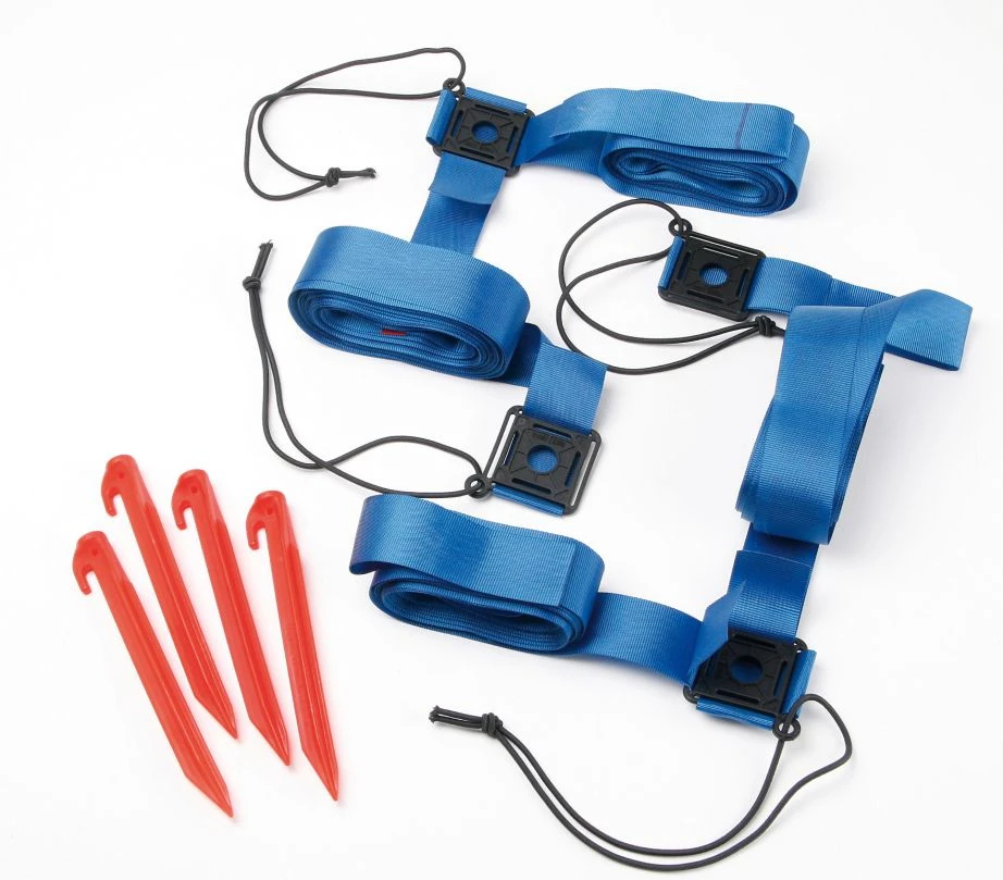 Beach-Volleyball oder Beach-Tennis Spielfeldmarkierung (Maße 9 x 18 m) mit verstellbaren Kunststoff-Eckelementen DBGM (auch verstellbar auf die Maße 8 x 16 m). Das dunkelblaue Gurtband aus Polyester hat eine Breite von 50 mm mit Kennzeichnung in der Mitte. Das Set ist komplett mit 4 Kunststofferdankern inkl. 23 cm langen Bungee-Spannleinen. Top-Wettspielqualität.