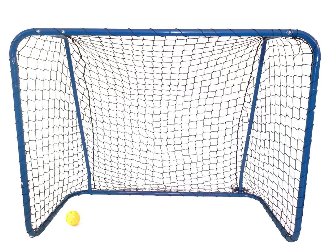 Stabiles Floorball & Unihockey-Tor aus pulverbeschichtetem Stahlrohr in blau. Die zusätzlichen Streben am Tor machen es nochmals stabiler. Das Netz ist inkludiert und aus Polyester.