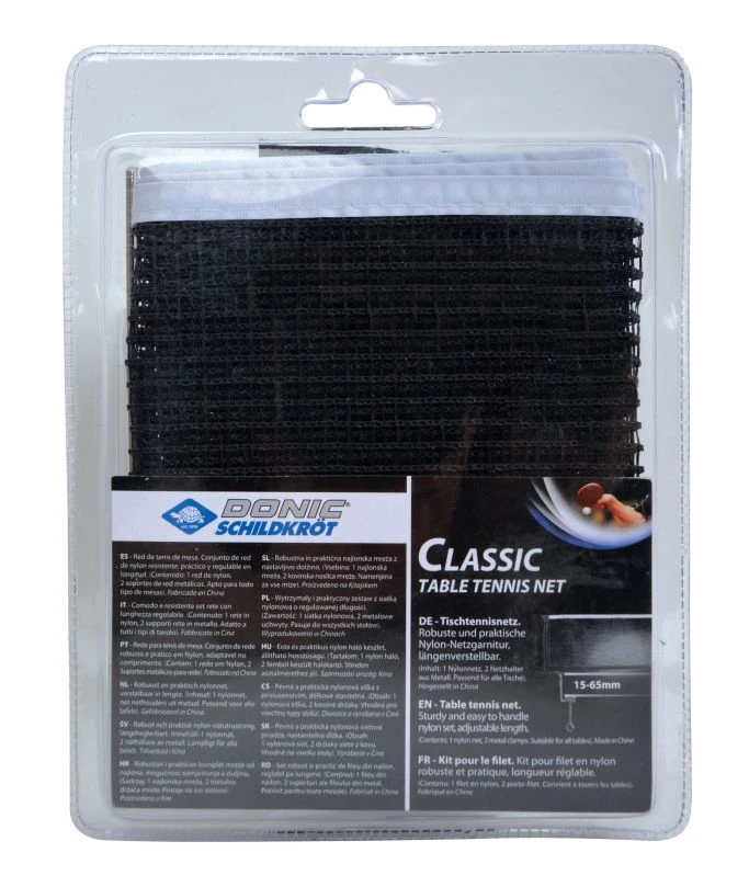 Die Basic Netzgarnitur „Classic“ aus dem Hause Schildkröt aus Metall ist das ideale Netz für gelegentliches Tischtennis-Spielen. Sie ist längenverstellbar, das Netz ist aus robustem, langlebigem und wetterfestem Nylon-Material. Besonders bei diesem Netz ist die maximale Plattenstärke: der Schraubmechanismus passt auf Platten bis zu 6,5cm Dicke. Das Netz ist verpackt im Blister.