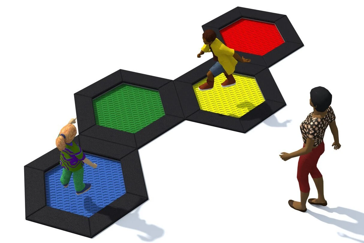 Ein Spielplatz ohne Trampolin ist kaum vorstellbar. Für die intensive Nutzung im öffentlichen Bereich ist das Trampolin mit Kunststofflamellen als Sprungmatte ausgestattet. Durch die V-förmigen Lamellen wurden die Abstände zwischen den Lamellen auf nur 7 mm reduziert, dadurch wird das Hereinfallen von kleinen Gegenständen wie Schlüsseln oder Mobiltelefone in den Trampolinkasten verhindert.