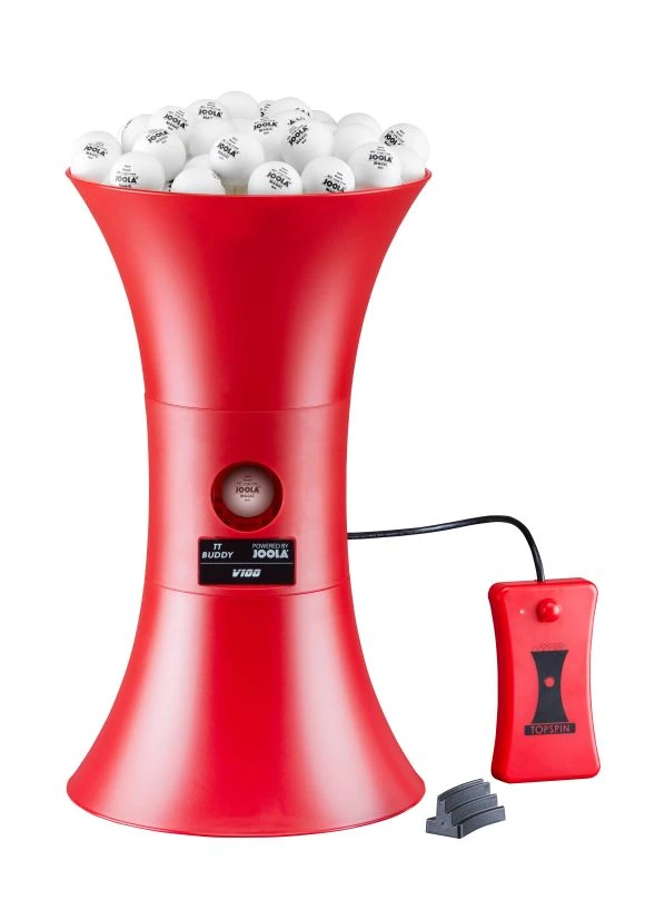 Der BUDDY TOPSPIN ist der ideale Trainingspartner für Anfänger. Mit der Fernbedienung kann die Ballfrequenz eingestellt werden. Es werden Topspinbälle ausgeworfen, das Ballfach fasst 100 Bälle. Batteriebetrieb (6 AA Batterien nicht im Umfang enthalten). Gewicht: 1,8 kg, Abstellmaße 48 x 28 x 28.