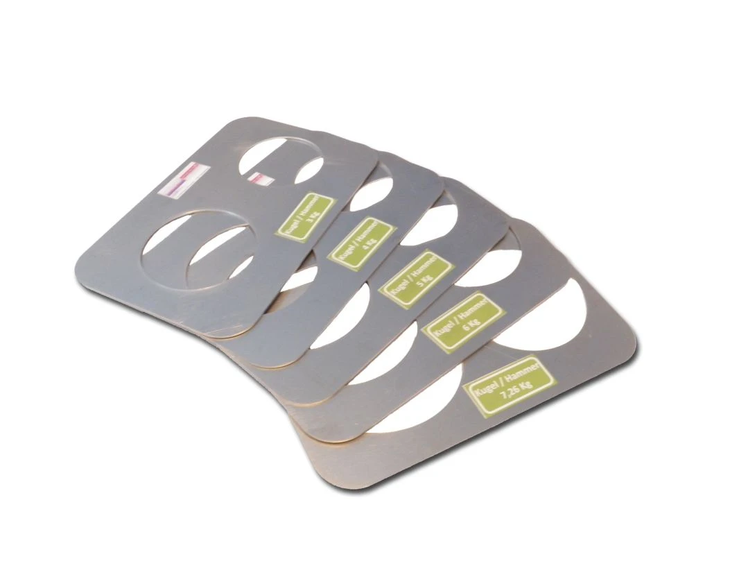 Die Kugel-Messlehre ist ein wichtiges Prüfgerät für Kampfrichter in der Leichtathletik: Die Messlehre besteht aus Aluminium und ist für die Prüfung des zulässigen Durchmessers von Stoßkugeln und Kugeln für Hammerwurf. Die Messlehre ist für Kugeln mit dem Gewicht 2kg, 3kg, 4kg, 5kg, 6kg und 7,26kg geeignet. Der maximal zulässige Durchmesser der Kugeln kann schnell und einfach durch ein Hindurchschieben der Kugel durch die große Aussparung geprüft werden.