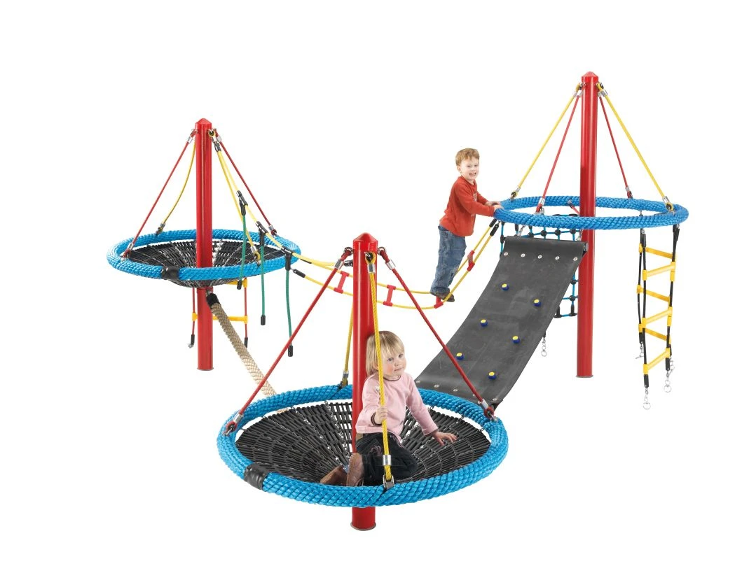 Vielseitiger Kletterturm mit 2 Original-Vogelnestern® als Plattformen in unterschiedlichen Höhen. Die drei Türme sind alle miteinander über unterschiedliche Balancier- und Kletterelemente als „Brücken“ verbunden. Zudem sind Strickleitern, ein Kletternetze und eine Laufmatte aus Gummi als Aufstiegshilfen vorhanden.