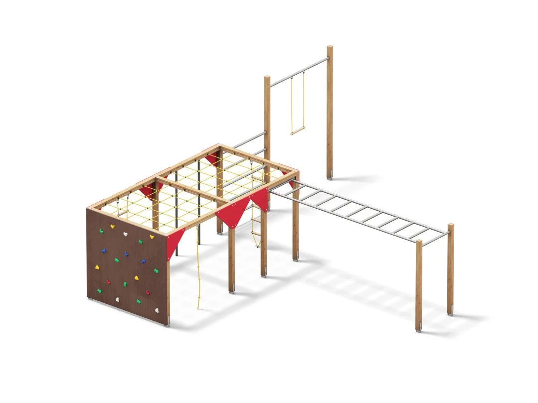 Viele Spiel-, Hangel- und Klettermöglichkeiten an einem Gerät. Standpfosten aus kesseldruckimprägnierten Nadelhölzern, sämtliche Stangen und Sprossen aus Edelstahl V2A.