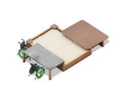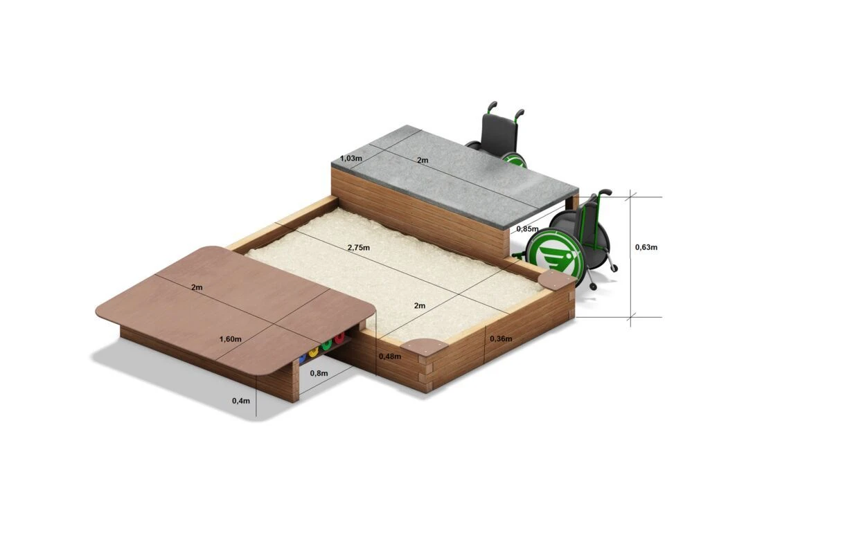 Dieser Sandkasten bietet zusätzlich Kindern mit Einschränkungen die Möglichkeit am gemeinsamen Spiel teilzunehmen. Kleinkinder können sowohl im Sandkasten sitzen, sich über die Tische legen oder direkt aus dem Rollstuhl mit dem Sand spielen. Ideal um jedem Kind die Möglichkeit zu bieten eine Sandburg zu bauen oder einen Matschkuchen zu backen. Der Kreativität ist dank Spielsand im Sandkasten keine Grenzen gesetzt.