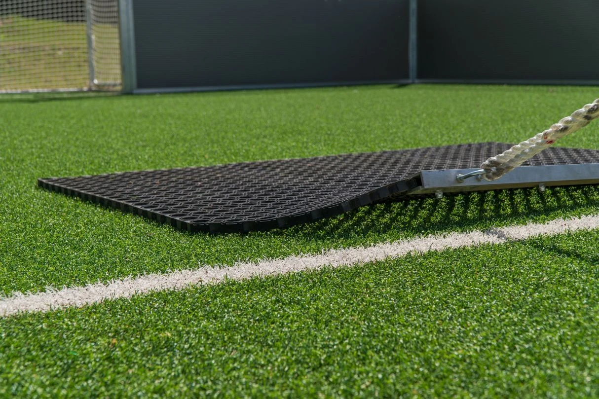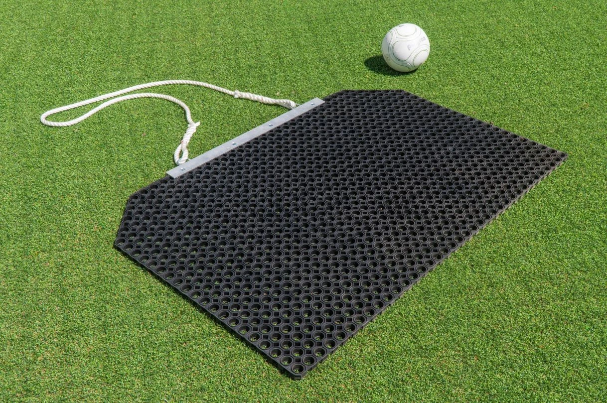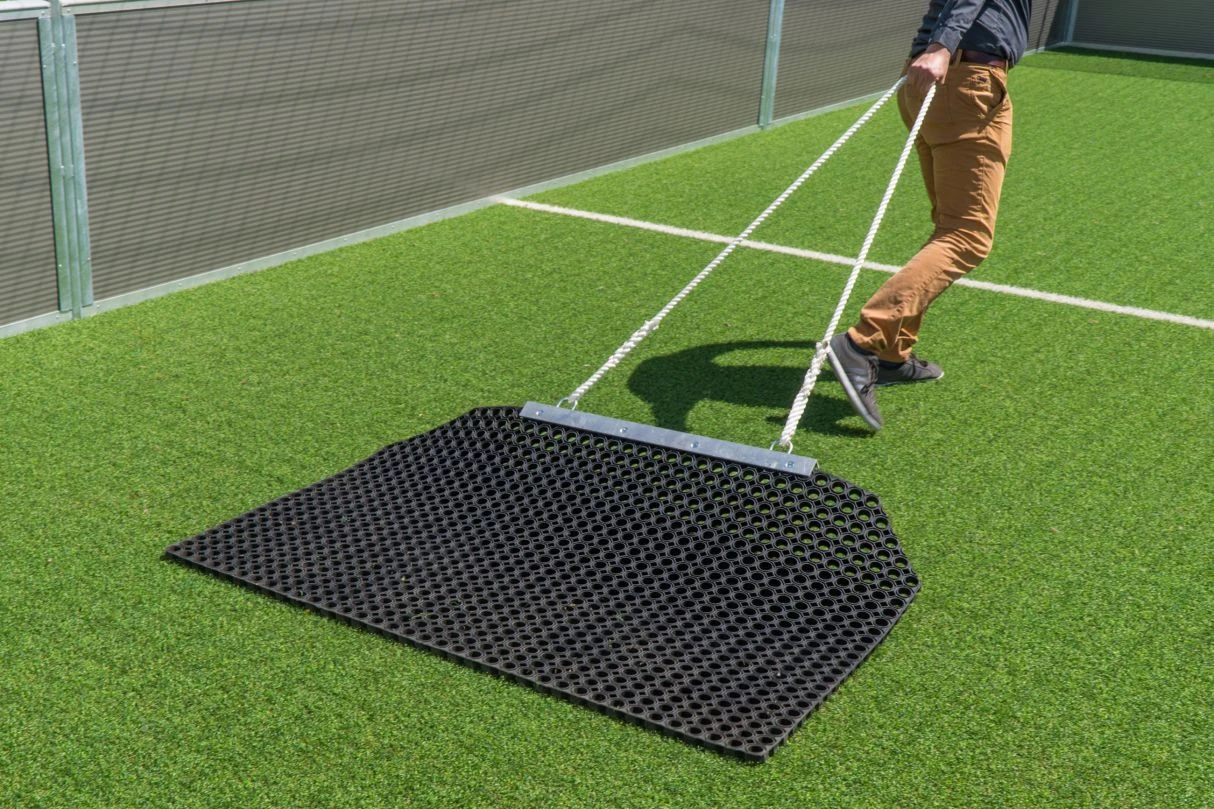 Um einen stets hohen Spielkomfort zu erhalten, muss die in Kunstrasensystemen enthaltene Granulatfüllung gleichmäßig über den Platz verteilt sein. Kritisch sind hierbei insbesondere die Torbereiche, da hier im Laufe der Zeit mehr Material herausgespielt oder umgelagert wird. Mit der Polytan Abziehmatte für Kunstrasenbeläge können Sie die Granulatfüllung effizient und gleichmäßig verteilen, sowie übermäßige Anhäufungen oder Senken ausgleichen.