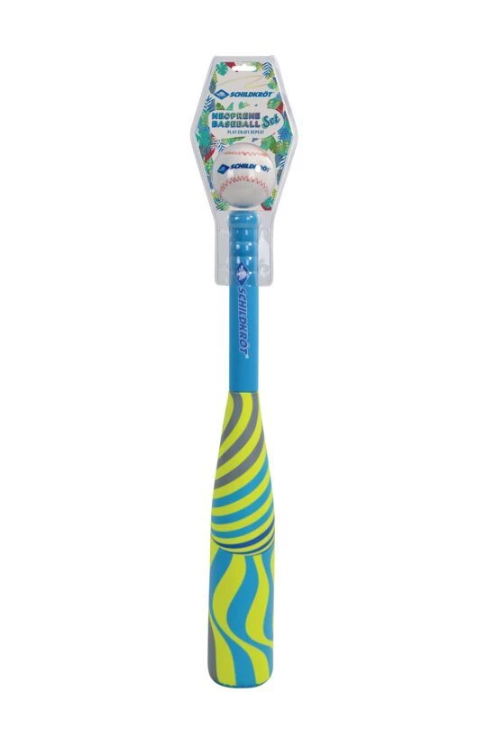 Weicher Baseballschläger von Schildkröt (62 cm, 200 g). Im Kern ist ein dünnes Kunststoffrohr, das mit Schaumstoff ummantelt und dann mit griffigem Neopren überzogen ist. So können schon die jüngeren ungefährlich an diesen coolen Sport herangeführt werden. Das Set ist salzwasserfest und somit auch ein beliebter Begleiter für Strand und Meer. Das griffige, textile Neopren liegt super und sicher in der Hand. Durch die weiche Konstruktion ist das Set weitgehend ungefährlich.