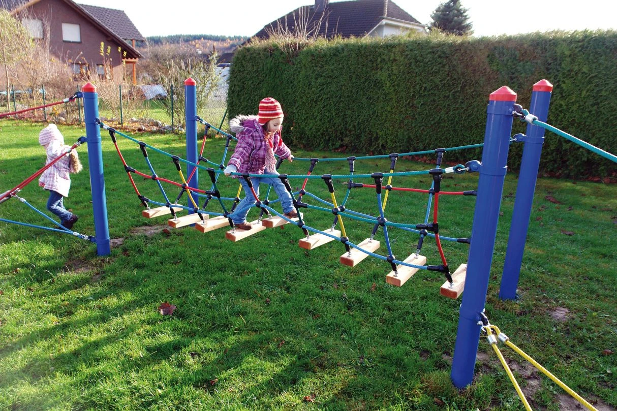 Kletter- und Balancierspaß für kleine Abenteurer ab 3 Jahren. Zur Überquerung des schwankenden Holzstegs können die Aufhängseile genutzt werden. Spielplatzgerät für Schulhöfe oder andere öffentliche Spielplätze. Holzsteg mit feuerverzinkten Stahlpfosten und Holzsprossen aus Douglasie. Pulverbeschichtung (Farbe) der Stahlpfosten nur auf Anfrage. Als Seile werden farbbeständige Herkulesseile mit Stahleinlage und besonderer Abriebfestigkeit eingesetzt. Die Kunststoffverbindungen der Seile sind robust und besitzen keine störenden Ecken und Kanten.