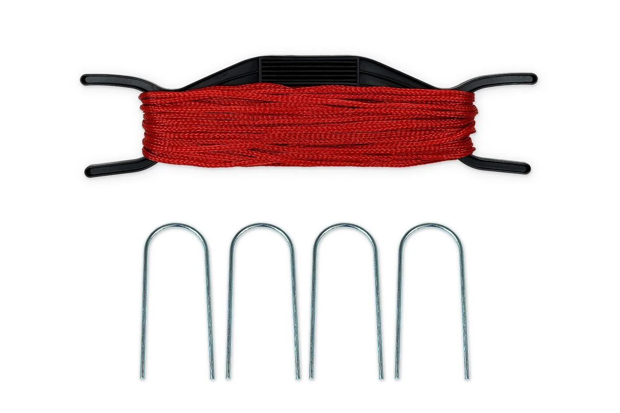 Einfache Spielfeldbegrenzung mit den Maßen 8 x 16 m aus 5,5 mm Polyseil. Dieses kommt zur praktischen Verräumung aufgerollt auf einer Haspel. Die U-förmigen Metallheringe sorgen für eine gute Verankerung an den Spielfeldecken.