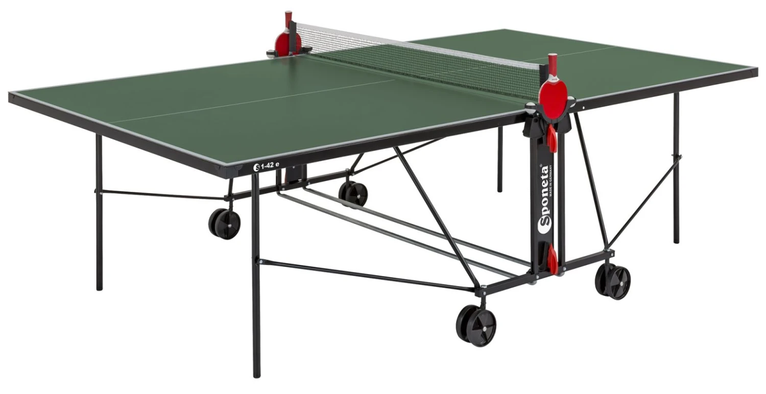 Diese solide Tischtennistisch Standardvariante von Sponeta ist für Outdoor TT-Aktivitäten geeignet. Die 4 mm starke Melaminharzplatte ist resistent gegen Feuchtigkeit, allwetterfest und fest verklebt mit der unterliegenden Metallkonstruktion. Die TT-Platte hat ein L-36 mm Rahmenprofil, welches pulverbeschichtet ist. Das TT-Untergestell (Compact Typ 4b) ist aus einem sehr stabilen, pulverbeschichteten Rundrohr mit Ø 25 mm. Der TT-Tisch besitzt 4 Doppelräder (Ø 125 mm) und ist nach Europäischer Norm EN 14468-1 zugelassen. Zudem sind seitlich 2 Ball- und Schlägerhalter angebracht.