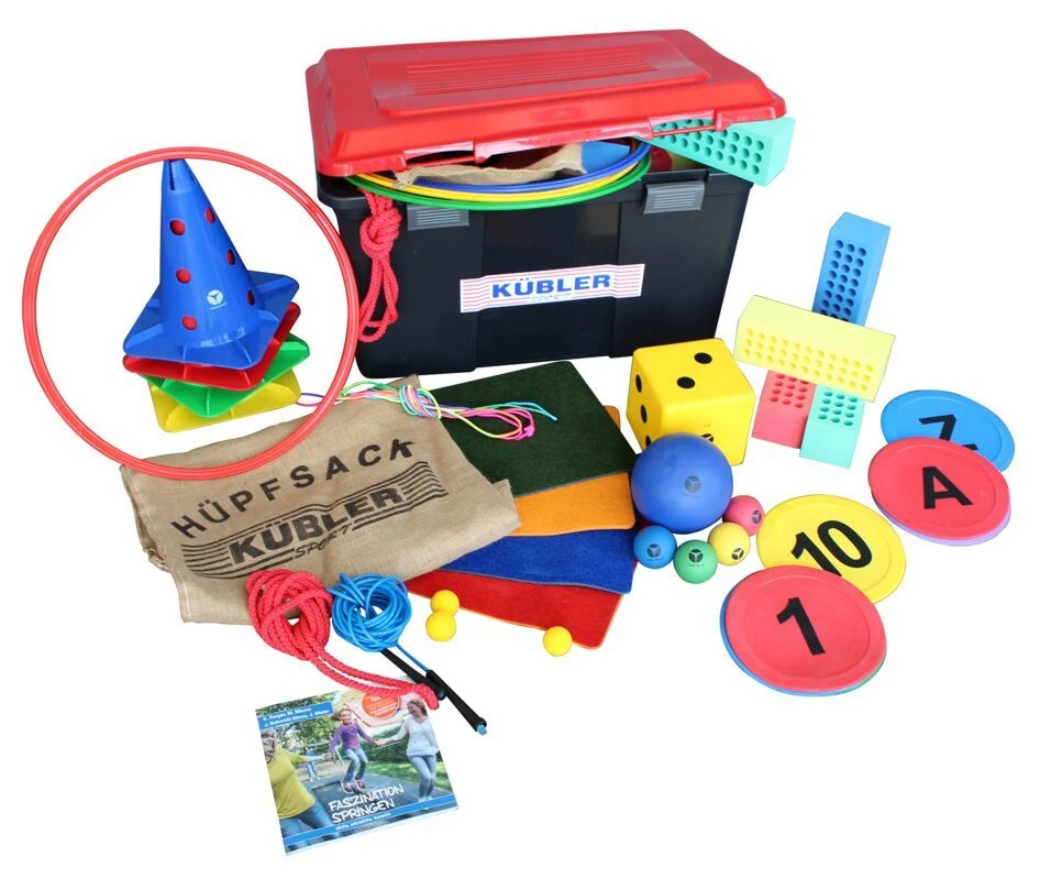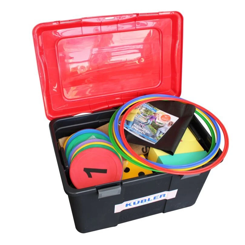 Die abwechslungsreiche Sportbokx fürs Trampolinspringen enthält ausgewählte Sportprodukte, die sowohl im Kindergarten, als auch auf Pausenhöfen Spielspaß garantieren. Die bunte Mischung der Produkte kombiniert verschiedene Schwierigkeitsstufen für Einzelspiele aber auch vertrauensvolle Teamspiele. Enthalten sind Materialien für die Koordination, Beweglichkeit, Ausdauer und Balance.