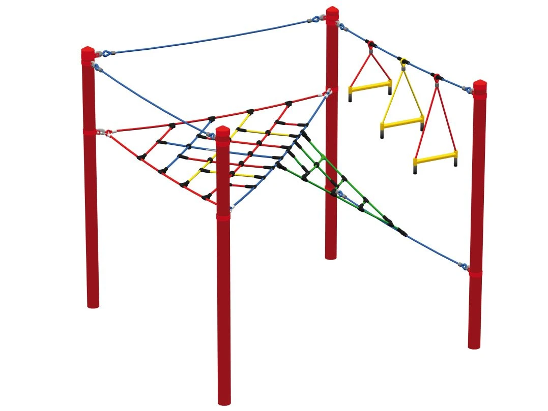Die einzelnen Elemente des Vario-Systems sind beliebig untereinander kombinierbar. Ein optimales Spielplatzgerät mit geringer Fallhöhe von 150 cm. Rasen ist deshalb als Fallschutz ausreichend geeignet (außer beim Element Spinnennetz: max. Fallhöhe 2,10 m). Das Rastermaß eines jeden Elementes beträgt 2,25 m. Die Seile und Netze aus Herkulesseil Ø 16 mm garantieren hohe Farbbeständigkeit und eine besondere Abriebfestigkeit.