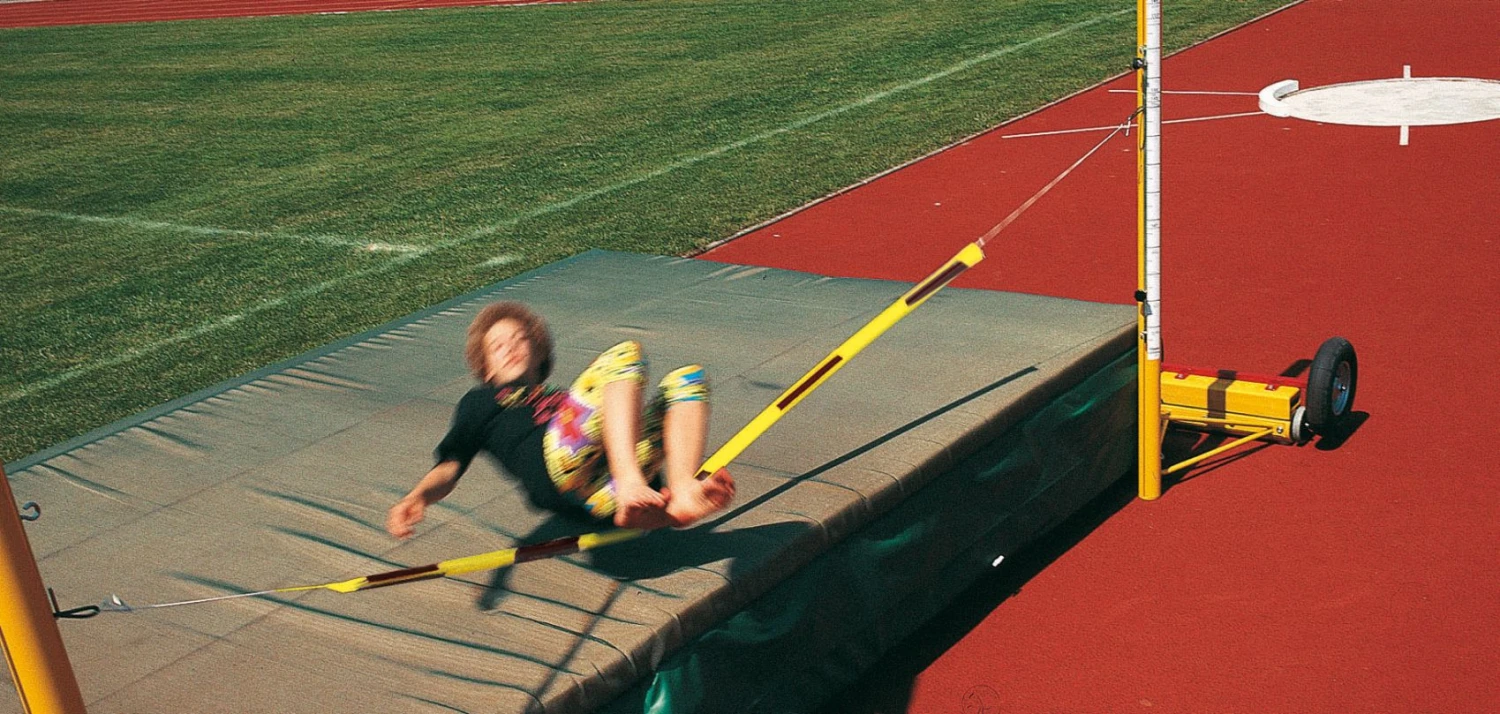 – Wird zwischen die Hochsprungständer gespannt
